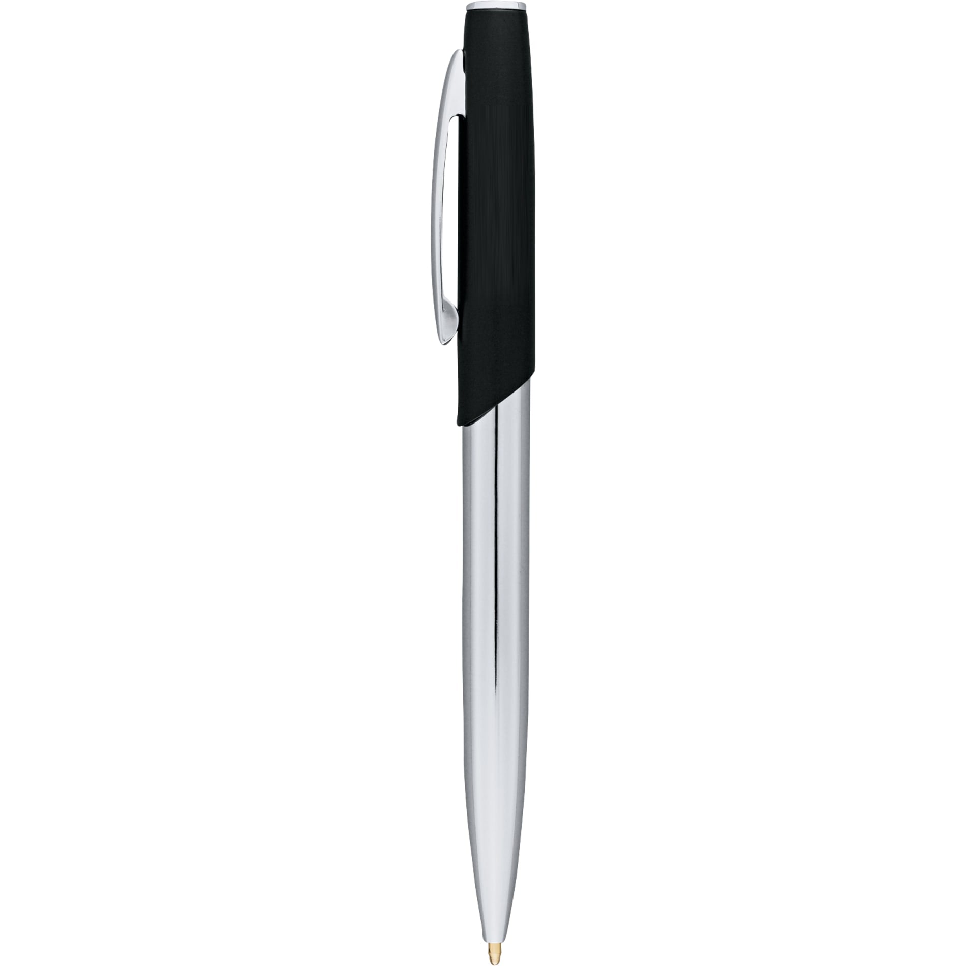 Sophisticated silhouette features matte upper barrel with shiny chrome lower barrel and matching chrome accents. Twist action mechanism. Pen includes premium black ink cartridge. Laser finish is shiny chrome.