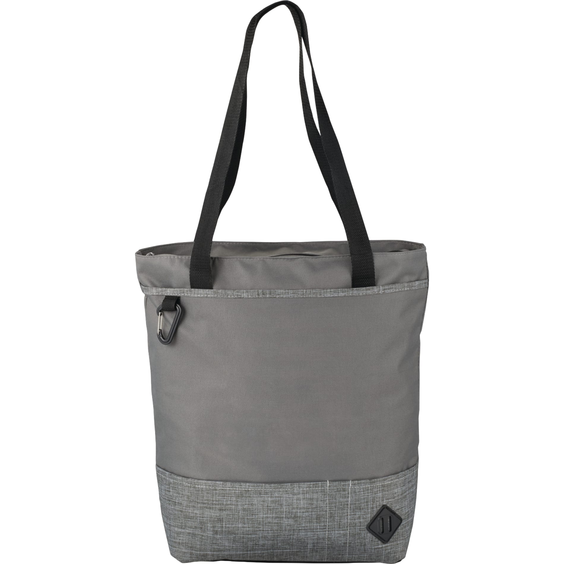 This is the ideal trendy convention tote. Zippered main compartment. Hook and loop closure front slash pocket. Phone and organizational pockets running along the base of the tote including a pen slot. D-ring and added corner detail to hang keys or water bottle. 14.5" handle drop height. Disclaimer: There may be minor variations in color of the actual product due to the nature of the fabric dyes, weaves and printing.
